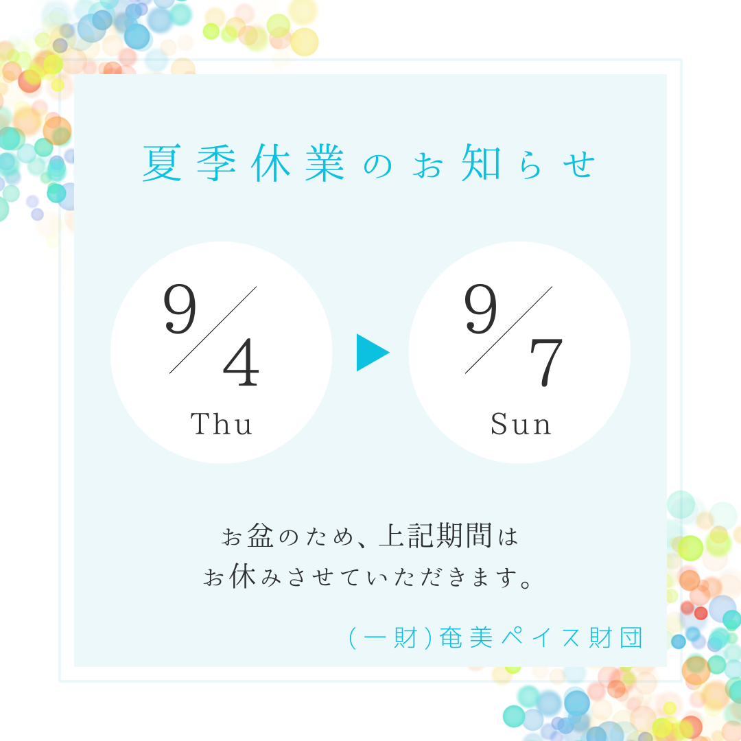 夏季休業のお知らせ Uncategorized X Facebook はてブ LINE コピー 2025.09.032025.09.22 奄美ペイス財団は、9月4日(木)〜7日(日)の期間、夏季休業とさせていただきます。奄美の季節の節目にあわせ、少しだけお休みをいただきます。 ご理解のほど、よろしくお願いいたします。