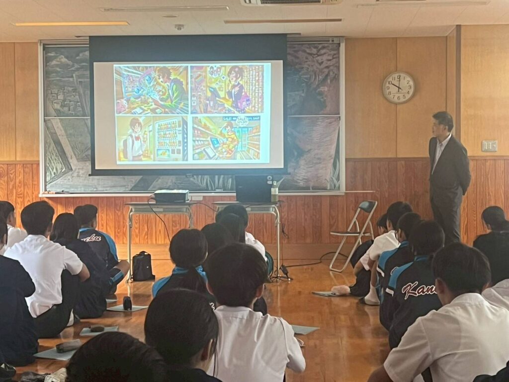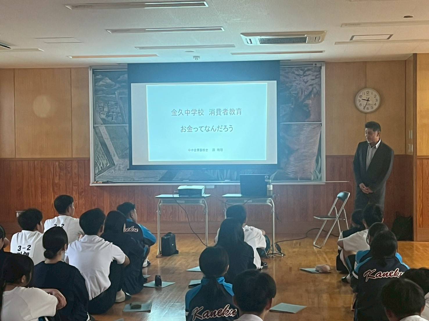 当財団理事の原(中小企業診断士の資格有)が、金融教育の一環として、奄美市立金久中学校の3年生を対象に「お金のしくみ」に関する講話を行いました。