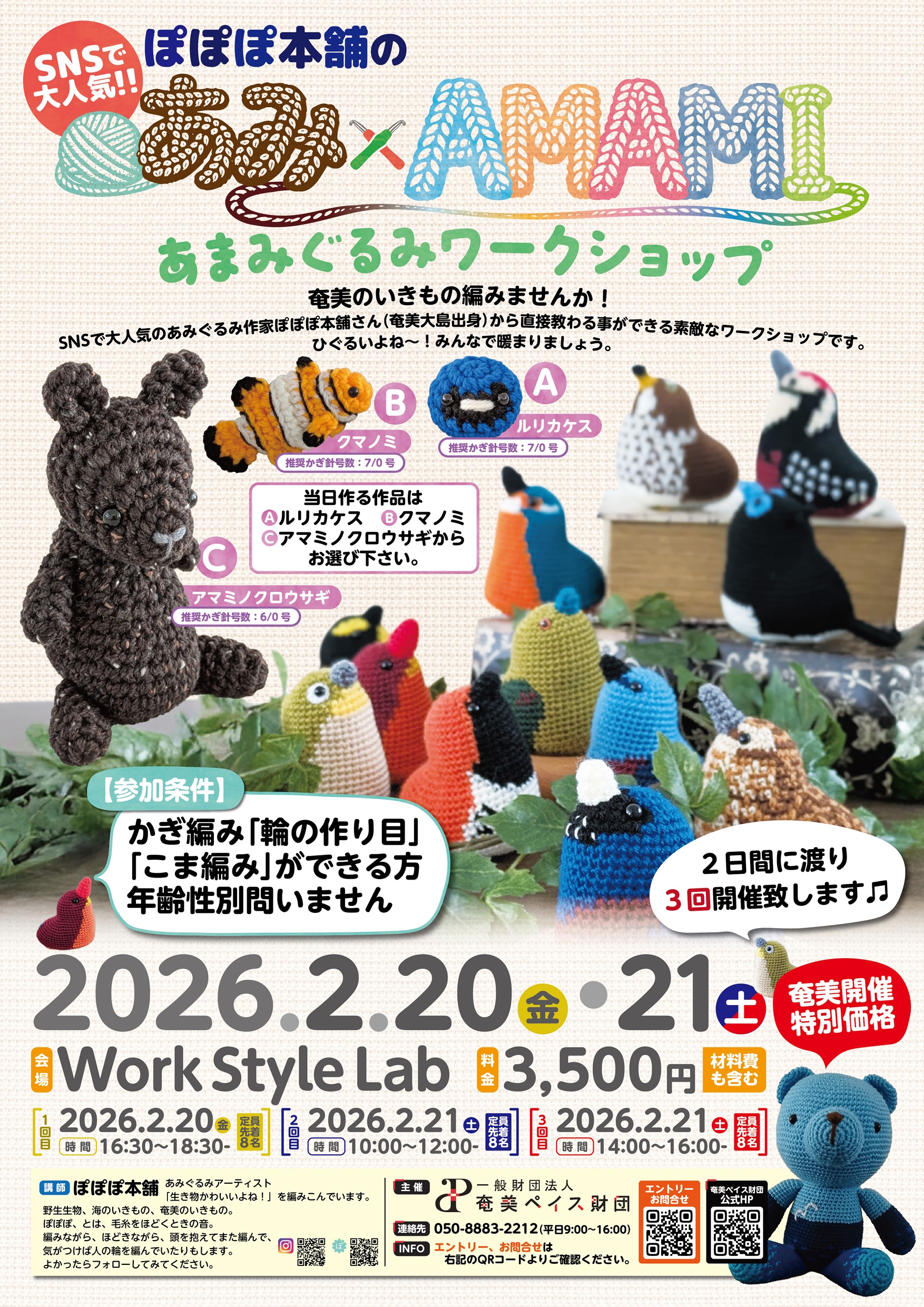 このたび奄美ペイス財団では、SNSで大人気!あみぐるみ作家 ぽぽぽ本舗・河本珠美さん(奄美大島・古仁屋ご出身)を講師にお迎えし、 「ぽぽぽ本舗のあみ×AMAMI ~あまみぐるみワークショップ~」を開催します!